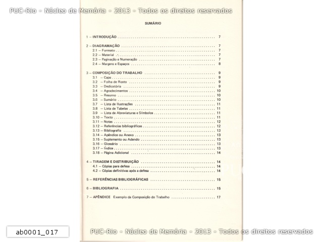 Sumário de A Pós-Graduação na PUC-RJ VI - Normas para Apresentação de Teses e Dissertações, dividido em sete partes com normas para diagramação, composição do trabalho, tiragem e distribuição, referências bibliográfica, bibliografia e apêndice. |