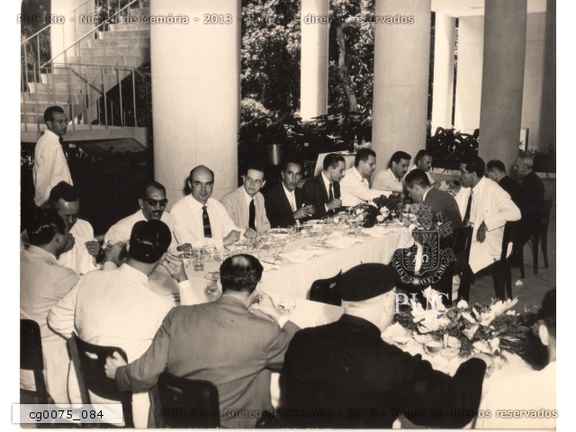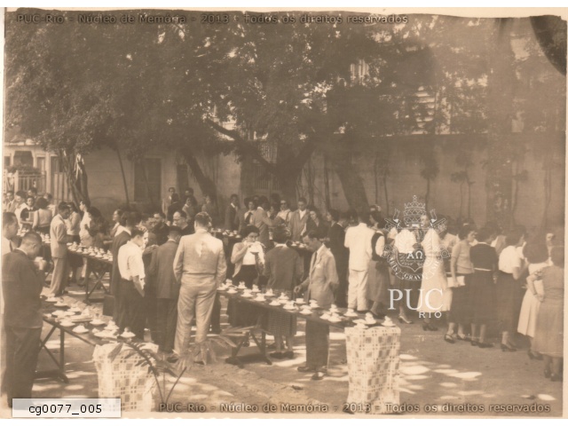 Almoço, talvez referente ao Dia do Reitor, nos pilotis do Edifício Cardeal Leme, na altura do bloco C, no qual há acima dos elevadores a placa comemorativa da inauguração do campus Gávea. |