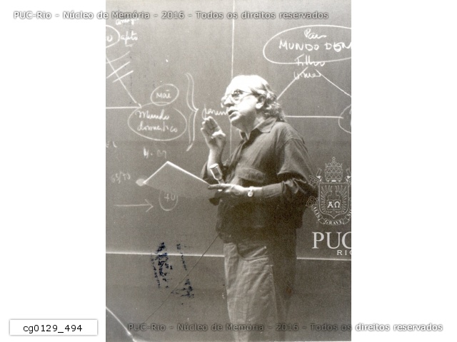 Professor não identificado ministra aula do "Projeto NovIdade", que tinha por objetivo abrir a Universidade para pessoas com mais de 60 anos. O curso tinha a duração de três meses e os alunos participavam de seminários, fóruns de debates e aulas expositivas de Filosofia, Psicologia, Sociologia, Ética, Problemas Sociais, entre outros. O Projeto NovIdade foi criado em 1992 pela professora Terezinha Arnaut do Departamento de Serviço Social da PUC-Rio. |