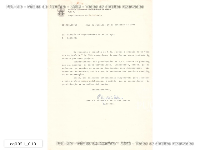 Correspondência interna de autoria da diretora do Departamento de Psicologia, profa. Maria Elizabeth Ribeiro dos Santos, para a Reitoria, em resposta à circular enviada pelo Reitor sobre a criação do Centro de Memórias. |
