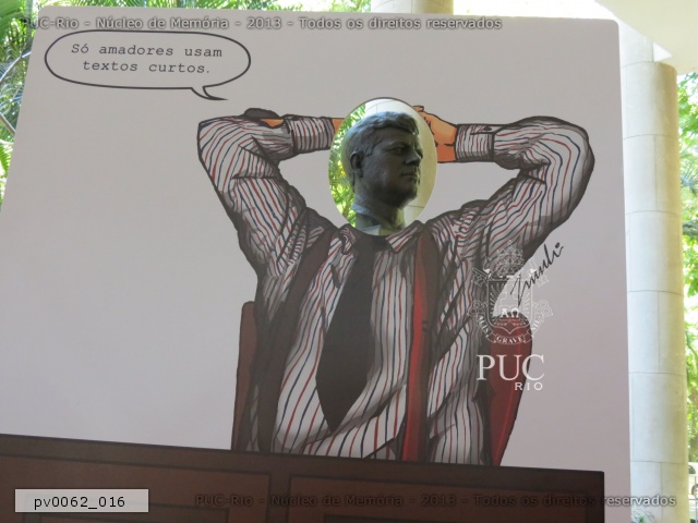 Instalação da exposição 'Centenário David Ogilvy' aproveita o busto de Kennedy nos pilotis. O evento foi realizado por alunos dos Departamentos de Comunicação e de Artes e Design da PUC-Rio em homenagem ao célebre publicitário escocês. |