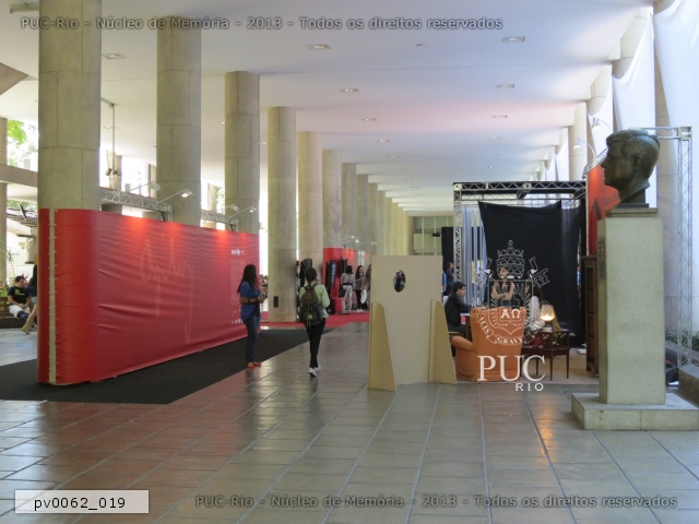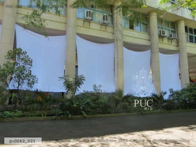 Os pilotis da Ala Kennedy sustentam as instalações da exposição 'Centenário David Ogilvy', realizada por alunos dos Departamentos de Comunicação e de Artes e Design da PUC-Rio em homenagem ao célebre publicitário escocês. |