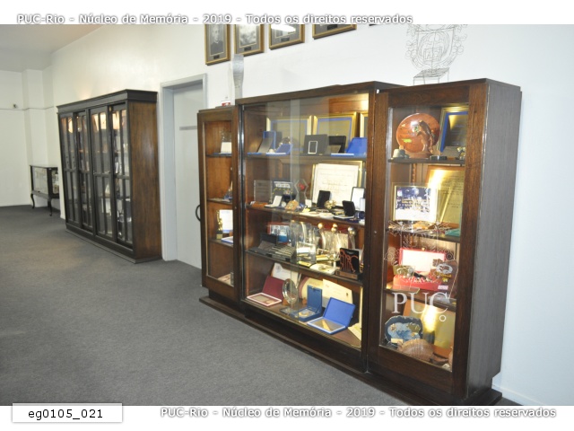 Armários da sala de entrada da reitoria da PUC-Rio com diplomas, medalhas, placas, vasos e esculturas recebidas de instituições de ensino superior e empresas, documentos e quadros com fotos dos reitores, calendários, cartas, cartões de Natal e álbuns de fotografias da PUC-Rio. |