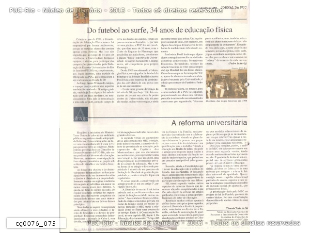 Jornal da PUC - 50 anos campus Gávea. P.8 - "Do futebol ao surfe, 34 anos de educação física"; "A reforma universitária". Com fotos. |
