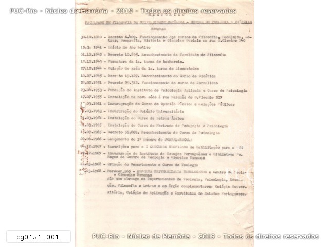 Histórico da Faculdades de Filosofia da Universidade Católica - Centro de Teologia e Ciências Humanas. De 30/10/1940 a 15/03/1968. Efemérides pontuais. |