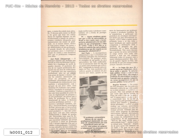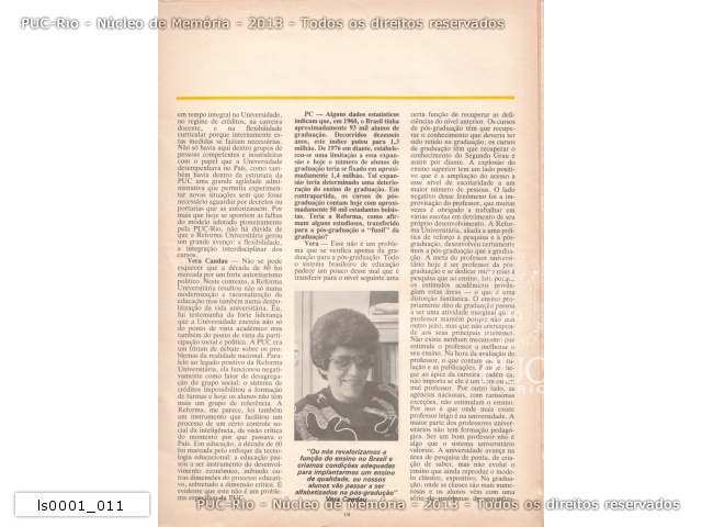 Entrevista com quatro professores da PUC-Rio, nesta página fala dos professores Vera Maria Ferrão Candau do Centro de Teologia e Ciências Humanas, pe. Antônio Geraldo Amaral Rosa que era então Vice-Reitor Acadêmico e uma citação do prof. Rogério Werneck do Centro de Ciências Sociais. |