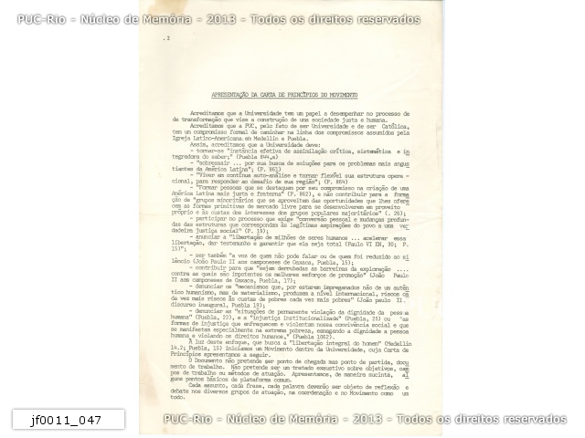 Página 01. Apresentação dos princípios do MUSP - Movimento Universidade a Serviço do Povo, baseados na linha de compromissos assumidos pela Igreja Latino-Americana em Medellin e Puebla. |