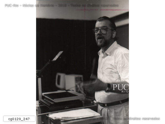 Foto do professor Carlos Chaves, publicada no Jornal da PUC, em matéria sobre o seu novo método de ensino que utilizava recursos de multimídia. |