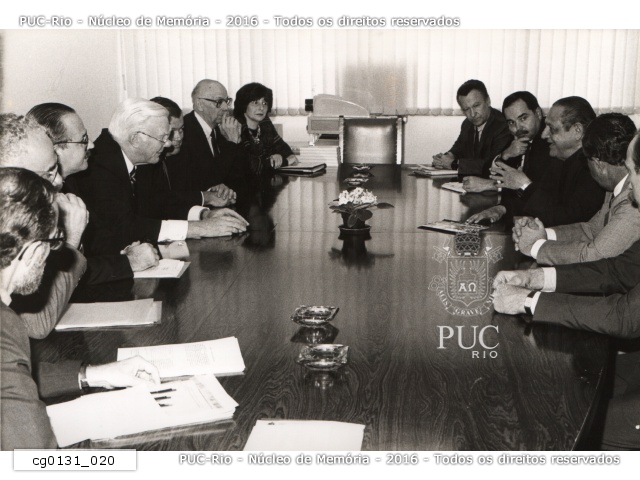 O reitor Padre Laércio, vice-reitores e decanos se reúnem com Robert D. Kennedy, presidente da Union Carbide Corporation e da Inroads Inc. O encontro foi idealizado com a iniciativa de estreitar os laços da Universidade com empresas nacionais e estrangeiras. |