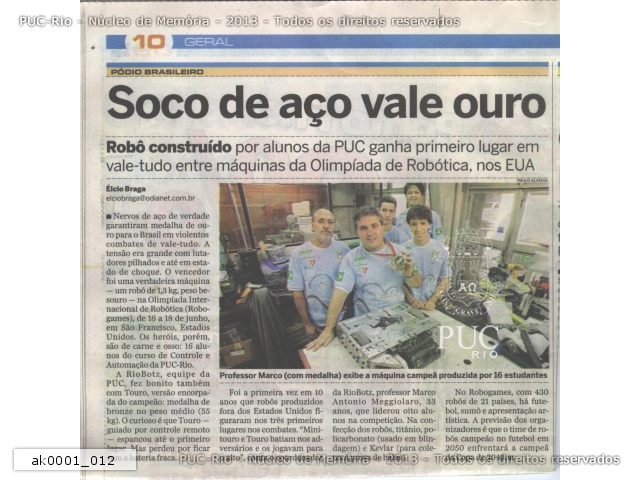 Artigo do Jornal O Dia, "Soco de aço vale ouro", sobre a equipe RioBotz. |