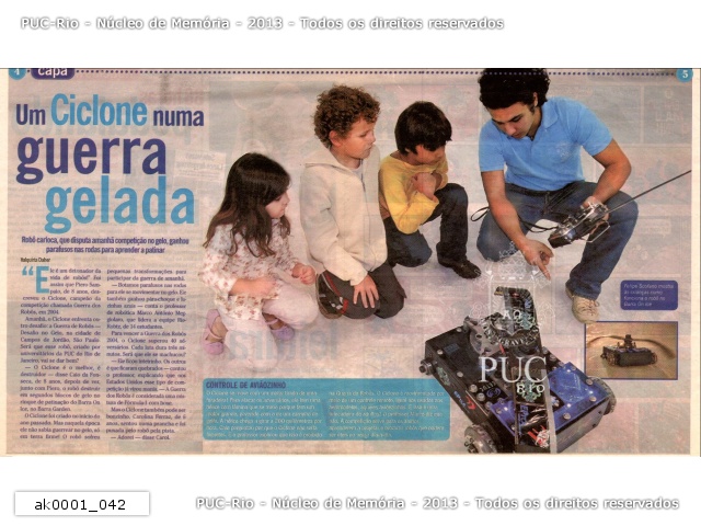 Artigo do suplemento Globinho, do O Globo: "Um Ciclone numa guerra gelada". Imagem do robô Ciclone com crianças. |