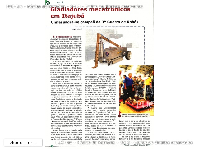Artigo da Revista Mecatrônica Fácil, "Gladiadores mecatrônicos em Itajubá". Foto da equipe da PUC-Rio. |