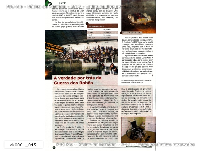 Artigo do PUC Urgente no. 880, p.3, entrevista com professor Marco Antonio Meggiolaro (MEC): "Aula de Introdução à Engenharia promove disputa de robôs". |