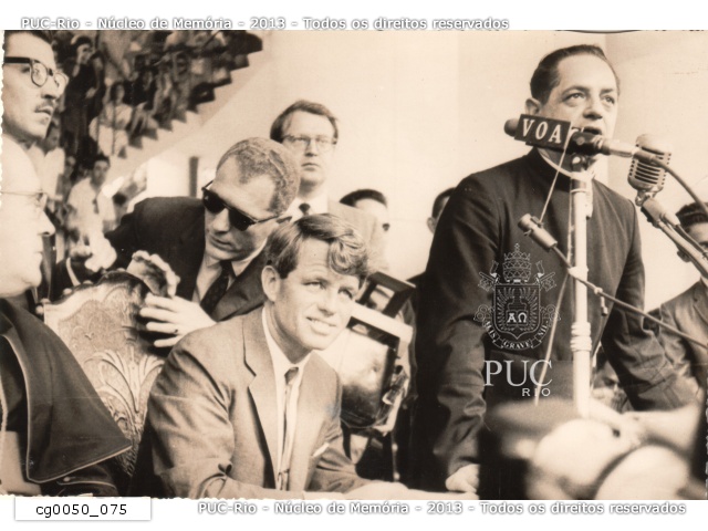O senador Robert (Bob) Kennedy, ao lado do reitor pe Laércio S.J., prepara-se para fazer um pronunciamento antes da inauguração do busto de seu irmão, John Kennedy, nos pilotis do Edifício da Amizade. Vê-se na foto o microfone da VOA - Voice of America. |