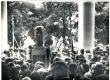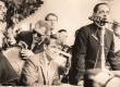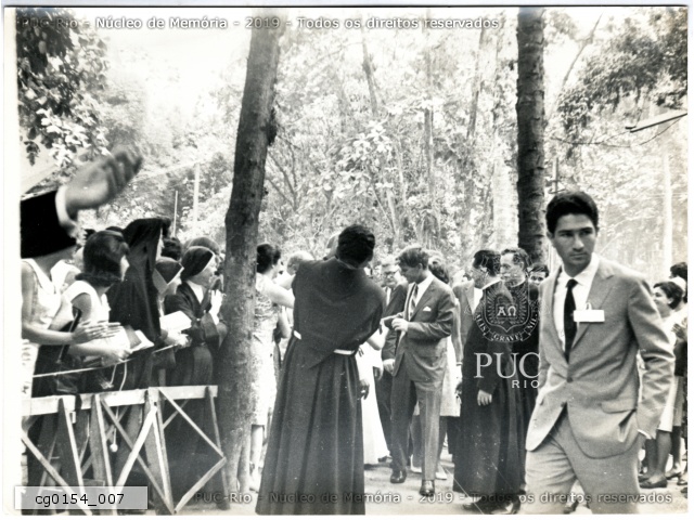 O senador Robert (Bob) Kennedy cercado pelo público presente à inauguração do busto de seu irmão, John Kennedy. Ao lado direito de Kennedy, o reitor pe. Laércio S.J. e o pe. Cullen S.J.. |