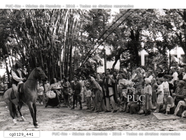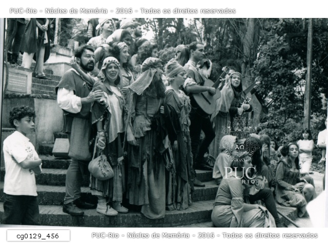 Atores encenam a peça infantil "Robin Hood" nas escadarias do Solar. A peça foi encenada aos finais de semana no campus da PUC-Rio e ficou em cartaz de outubro de 1995 até março de 1996. . |
