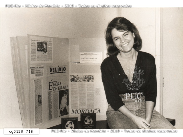 A aluna Silvia Balestreri Nunes com os recortes de jornais e revistas que apresentou na defesa da sua dissertação mestrado intitulada Teatro do Oprimido: Revolução ou Rebeldia?. A dissertação, defendida no Departamento de Psicologia da PUC-Rio, aborda a experiência de Silvia no Teatro do Oprimido de Augusto Boal. |