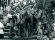 Atriz da Companhia Carroça de Mamulengos posa para foto ao lado de espectadores no final do espetáculo teatral, parte da Semana Terra e Expressão, organizado pelo Coletivo Cultural, um grupo formado por alunos de diversos departamentos. A temática da semana era "a luta dos que não possuem terra para trabalhar" (Jornal da PUC no. 73, maio de 1997). |