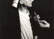 Ator da Companhia Carroça de Mamulengos aguarda o início da apresentação do grupo. Apresentam espetáculo teatral na Semana Terra e Expressão, organizado pelo Coletivo Cultural, um grupo formado por alunos de diversos departamentos. A temática da semana era "a luta dos que não possuem terra para trabalhar" (Jornal da PUC no. 73, maio de 1997). |