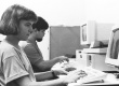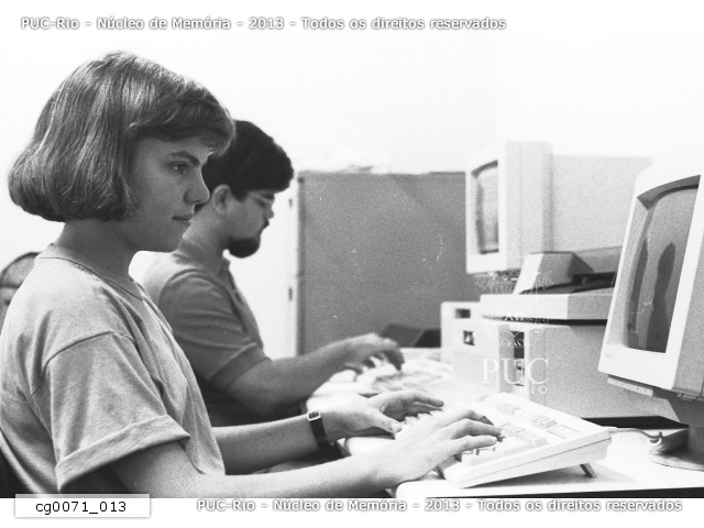 Alunos de Telecomunicações usando microcomputadores em laboratório do CETUC. |