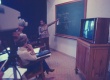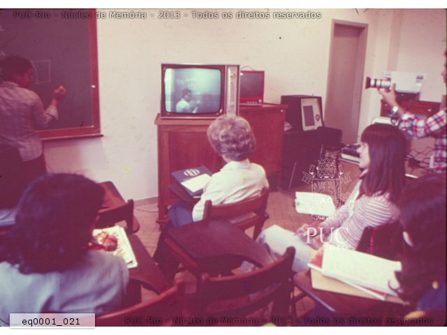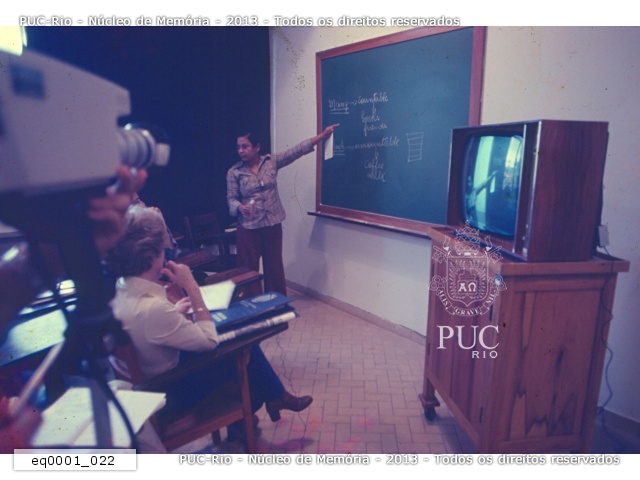 Aula sendo filmada numa espécie de video-teipe. Conforme o que está escrito no quadro em outra foto do mesmo conjunto, parece uma aula de língua inglesa. |