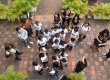 Atletas com o uniforme da PUC-Rio em uma das escadarias da Universidade. Parecem ser da equipe de remo. |
