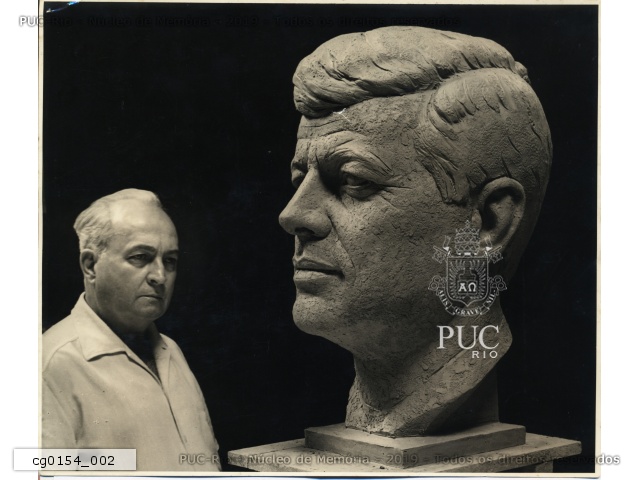 O escultor Heitor Leão Velloso ao lado do busto de John Kennedy, por ele produzido, aparentemente ainda na versão em argila. A escultura final foi produzida em bronze e teria sido financiada a partir de campanha de alunos organizada pelo pe. Francisco Machado S.J., segundo o Jornal do Brasil de 17/09/1965, p. 5. |