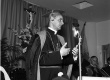 Cardeal Giovanni Battista Montini, futuro Papa Paulo VI, discursa após receber o título de Doutor Honoris Causa. Ao lado, sentado, o presidente Juscelino Kubitscheck. Microfone da Agência Nacional. |
