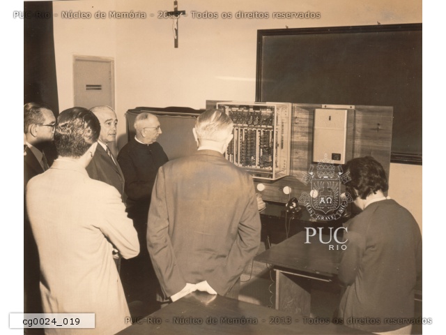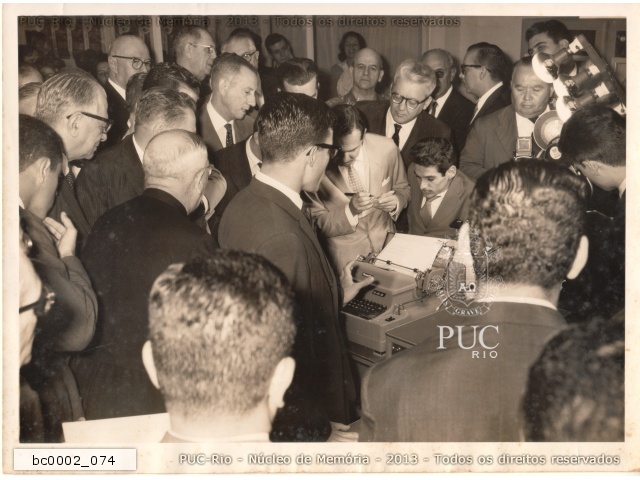 O computador Burroughs 205, primeiro computador da PUC-Rio, cercado por pessoas que observam a máquina de escrever/impressora no dia da inauguração do Centro de Processamento de Dados. |