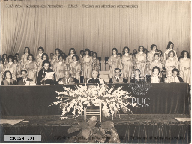 Mesa com autoridades da Universidade e alunos formandos em Letras Anglo-Germânicas em arquibancada montada no palco do Ginásio. Cerimônia de formatura. |