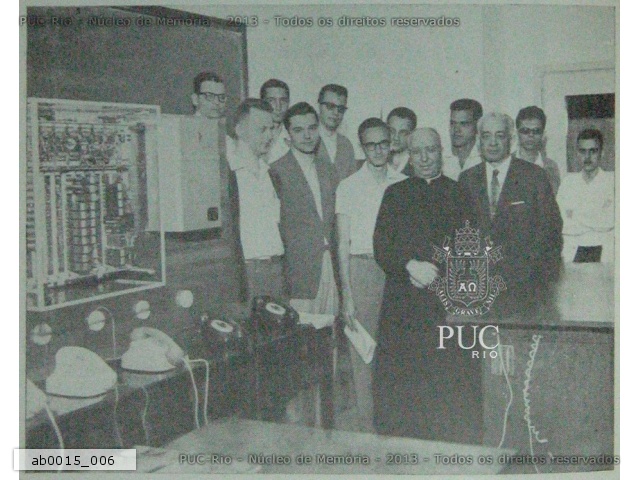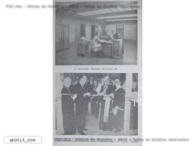 O presidente da República, Juscelino Kubitschek, inaugura o computador eletrônico Burroughs 205, primeiro computador da PUC-Rio, por ocasião da visita do cardeal Montini, futuro Papa Paulo VI. |