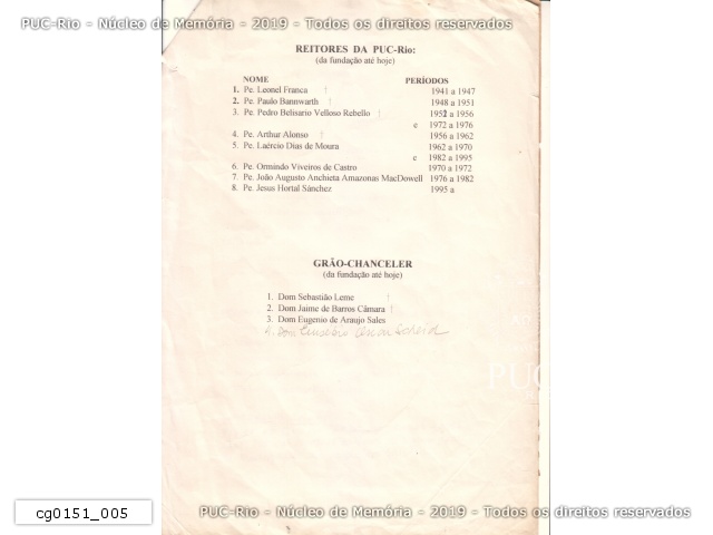 Lista dos reitores da PUC-Rio até 1995 (Pe. Hortal S.J.) com os períodos de gestão. Lista dos grão-chanceleres desde a fundação da Universidade. |