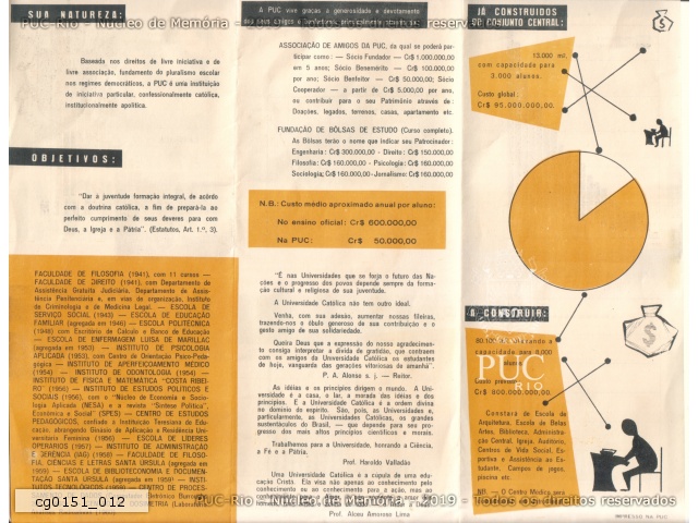 Verso de folheto de divulgação da PUC-Rio, com os itens "Sua natureza" ("pluralismo escolar", "confessionalmente católica, institucionalmente apolítica"), "Objetivos", "A PUC vive graças a generosidade e devotamento dos seus amigos e benfeitores", "Já construímos do conjunto central" e "A construir". Lista de cursos, institutos e núcleos existentes. Pequenos textos do Reitor Pe. Alonso S.J., do prof. Haroldo Valladão e do prof. Alceu Amoroso Lima. |