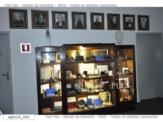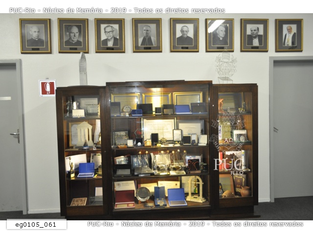 Sala de entrada da reitoria com armários com flâmulas, medalhas, placas, esculturas, diplomas, pratos brasonados, memorabílias e prêmios recebidos de instituições de ensino superior e empresas ou confeccionados pela PUC-Rio. Na parede, quadros com fotografias dos reitores da PUC-Rio. |