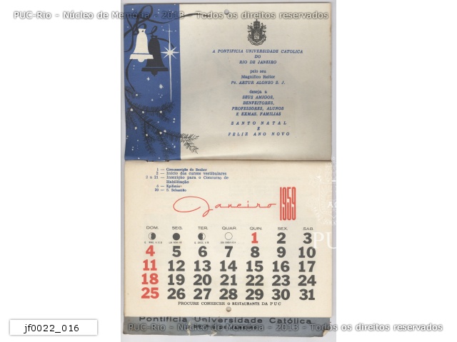 Mês de Janeiro no Calendário da PUC-Rio referente ao ano de 1959. Contém mensagem de Natal e Ano Novo do reitor pe. Artur Alonso S.J.. Na outra página a mensagem "Procure conhecer o Restaurante da PUC". |
