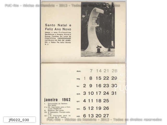 Calendário da PUC-Rio referente ao mês de Janeiro do ano de 1962. Fotografia do nicho da imagem de Nossa Senhora Aparecida, nas proximidades do Solar Grandjean de Montigny, e mensagem de Ano Novo e de Natal. |
