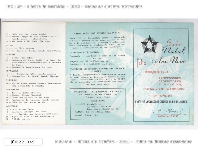 Calendário acadêmico da PUC-Rio referente ao segundo semestre de 1960. Contém informações sobre a Associação dos Amigos da PUC e mensagem de Natal e Ano Novo do reitor. |