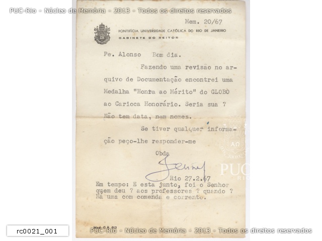 Carta endereçada pela Assembleia Legislativa do Estado da Guanabara ao pe. Artur Alonso Frias S.J., concedendo a ele o título de cidadão do Estado da Guanabara. |