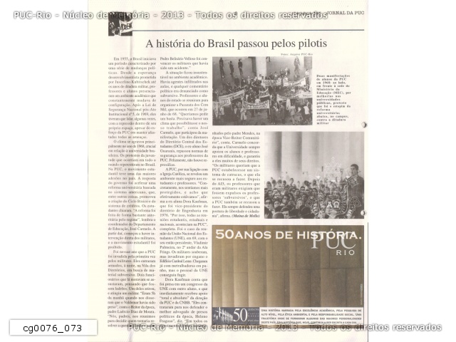 Jornal da PUC - 50 anos campus Gávea. P.6 - "A história do Brasil passou pelos pilotis". Com fotos, legenda com texto incorreto ao falar da reforma universitária. |