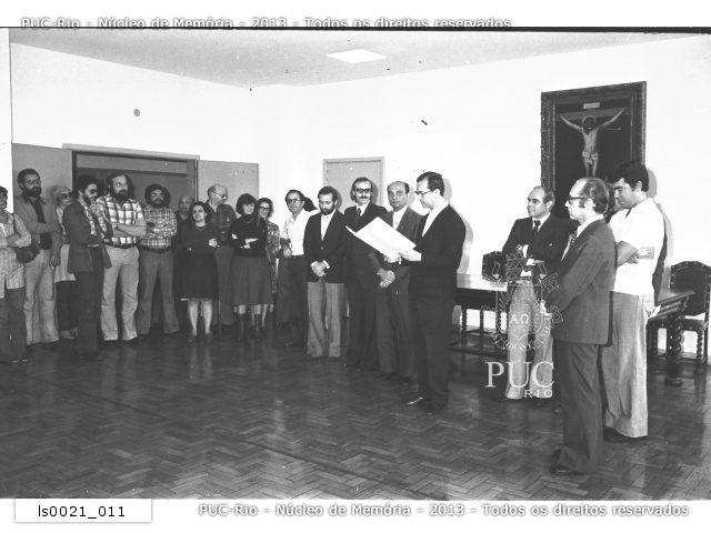 O pe. José de Souza Mendes S.J. lê o termo de posse dos dois novos diretores, os professores Fábio Macedo Soares Guimarães (HIS) e Tomaz Schneider (ECO). |