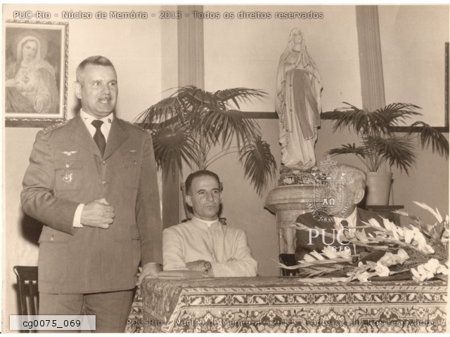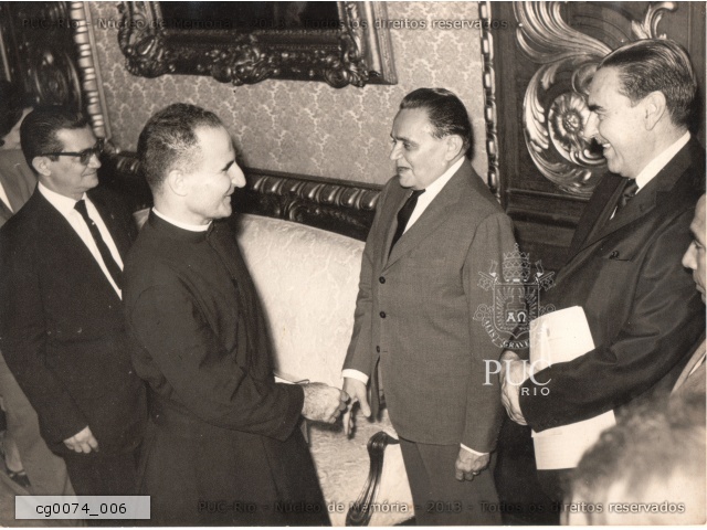Pe. Ormindo Viveiros de Castro S.J. cumprimenta o Presidente Castelo Branco. À direita, o embaixador dos Estados Unidos, Charles Burke Elbrick. |