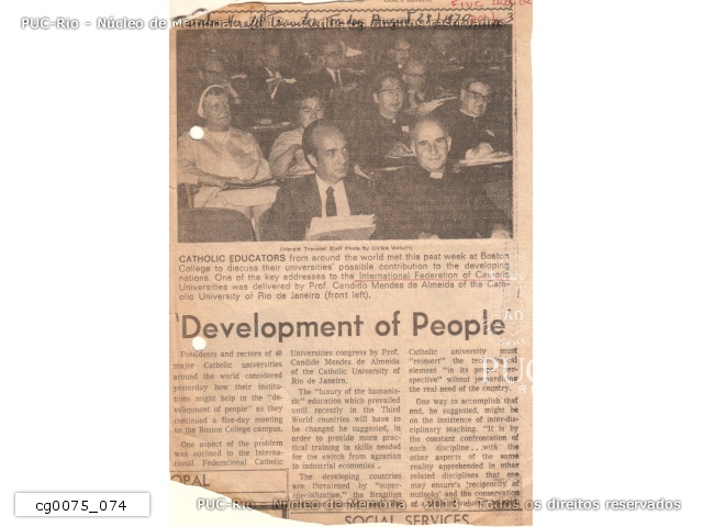 Reportagem do Boston Herald Traveler sobre educadores católicos, com foto em que aparecem o prof. Cândido Mendes e o Reitor pe. Ormindo Viveiros de Castro S.J.. |