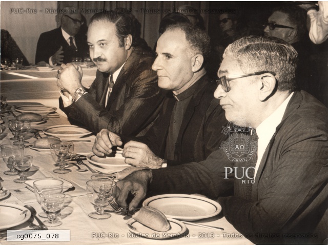 Almoço, talvez referente ao Dia do Reitor, nos pilotis do Edifício Cardeal Leme, na altura do bloco C, no qual há acima dos elevadores a placa comemorativa da inauguração do campus Gávea. |