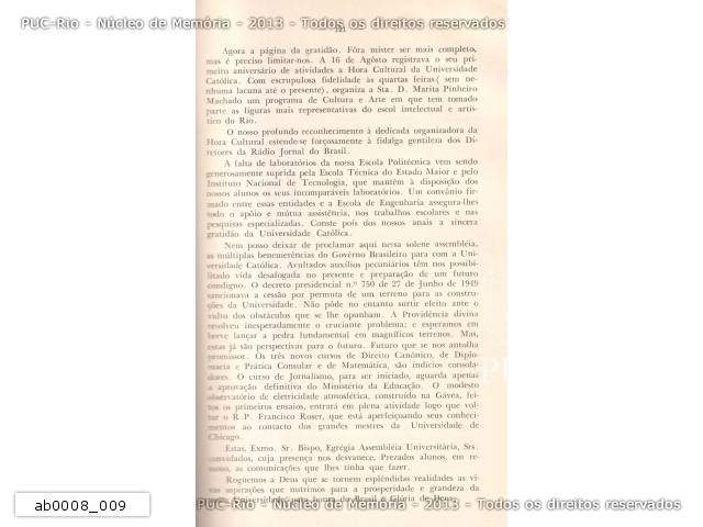 Discurso proferido pelo reitor pe. Paulo Bannwarth S.J., por ocasião da abertura solene dos cursos da Universidade Católica em 15/03/1950. |