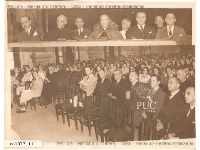 Dia do Reitor, com a presença do Ministro da Educação Gustavo Capanema. É exibida a bandeira da PUC-Rio. |