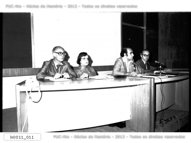 Mesa com palestrantes. Talvez seja a mesa de abertura, pela presença do Reitor. |