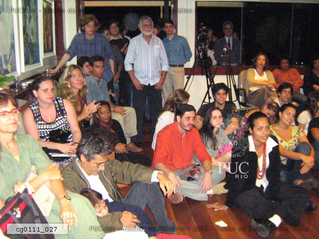 Autoridades políticas e professores da PUC-Rio participam do debate. |