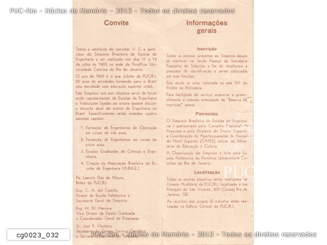 1965 no Ano Jubilar da PUC do Rio de Janeiro - Folder do Simpósio Brasileiro de Escolas de Engenharia na Escola Politécnica da Universidade Católica do Rio de Janeiro. Convite e Informações Gerais. Assuntos: formação de Engenheiros de Operação; formação de engenheiros em cursos de 5 anos; escolas graduadas de ciências e engenharia; criação da Associação Brasileira de Escolas de Engenharia. |
