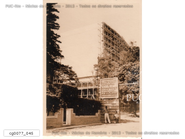 Obras do Edifício Central, depois Cardeal Leme. Vista a partir das frente de uma das casas remanescentes da vila que havia nos terrenos da PUC-Rio. Placa da construtora Severo e Villares, cujo engenheiro responsável era o prof. Carlos Alberto del Castillo. Dois homens perto do que seria o portão. |