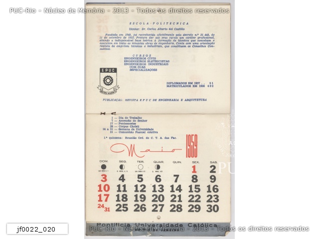Mês de Maio no Calendário da PUC-Rio referente ao ano de 1959. Contém informações sobre a Escola Politécnica. Referência à publicação da Revista EPUC de Engenharia e Arquitetura. |